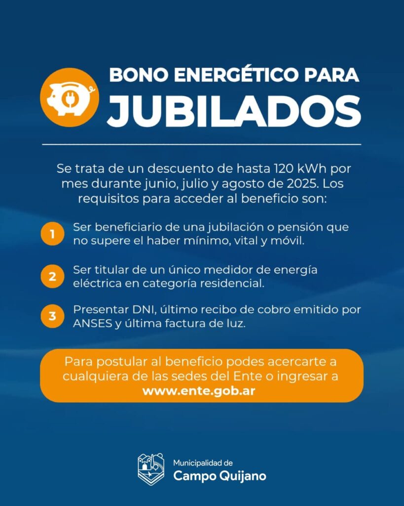 La Municipalidad de campo Quijano anunció la implementación del Bono Energético de Invierno, una ayuda económica destinada a jubilados y pensionados que perciben el haber mínimo nacional. El beneficio busca aliviar el impacto del consumo eléctrico durante los meses de junio, julio y agosto de 2025.