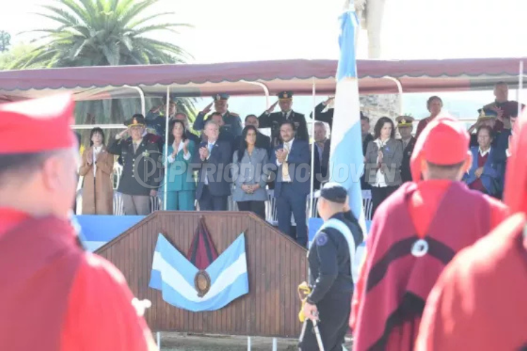 La ceremonia se desarrolló en el Campo Histórico La Cruz, donde el mandatario provincial fue recibido por el comandante de la V Brigada de Montaña, Ricardo Fresta.
