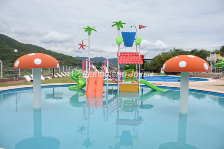 El parque acuático tiene un aforo de 400 personas y dispone de espacios diferenciados para niños y adultos. Cuenta con una pileta de más de 40 metros de largo por 16 de ancho, equipada con ocho toboganes acuáticos para adultos, una plaza de juegos y un sector infantil con mangrullo, dos hongos y un chorro de agua.
