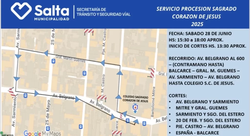 La Municipalidad de Salta llevará a cabo un operativo especial de tránsito, por la procesión del Sagrado Corazón de Jesús, prevista para hoy sábado 28 de junio desde las 15.30 horas.