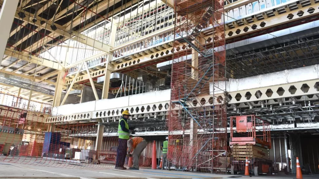 El recorrido incluyó el avance de sectores clave como el nuevo hall principal de check-in, la sala de embarque doméstico ubicada en el primer piso y las áreas técnicas vinculadas a la operación aeroportuaria. Se completó la demolición de los sectores entre los ejes 7 y 13, abarcando 3.900 m², y ya se encuentran finalizadas las fundaciones del núcleo central, con un avance del 70% de la estructura metálica, mientras continúa la demolición del área comprendida entre los ejes 1 y 7.
