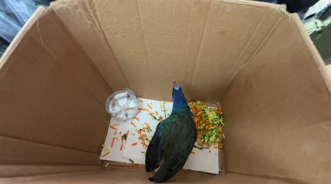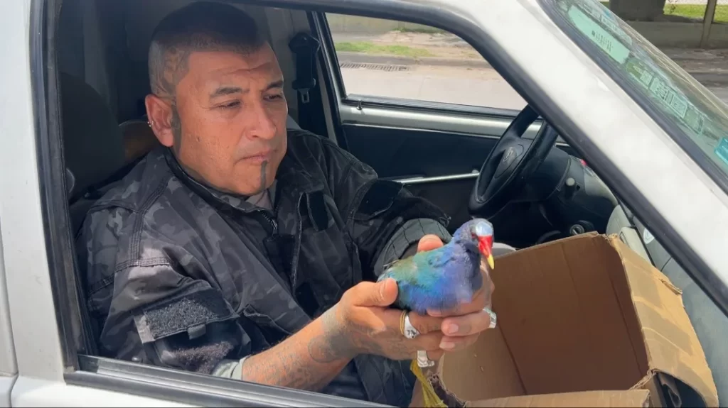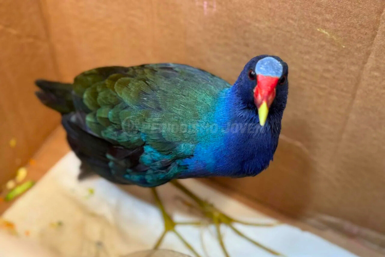 La Municipalidad acudió al llamado de un vecino que encontró un ave exótica conocida como pollona azul (Porphyrio martinica), y que aparentemente se encontraba desorientada.