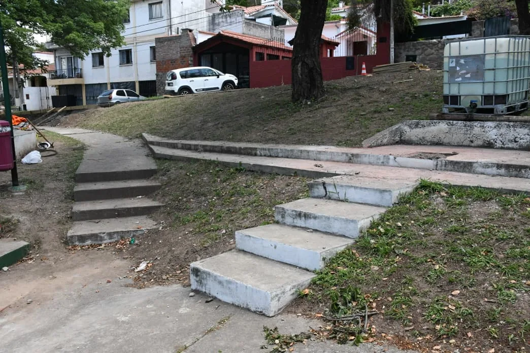 Las tareas incluyen la demolición de la vereda y caminería en el sector noreste, el encofrado de escalinatas y demolición y desmalezado de sectores específicos. El espacio verde se encuentra en el ingreso a la ciudad (Portezuelo).