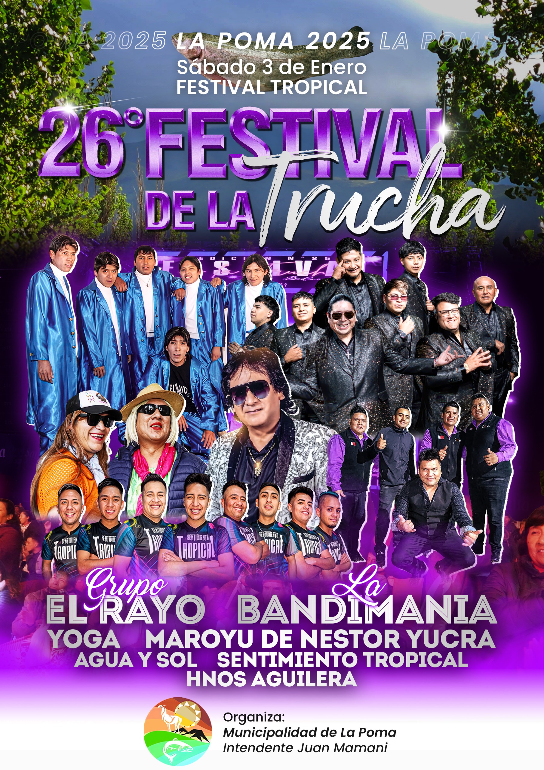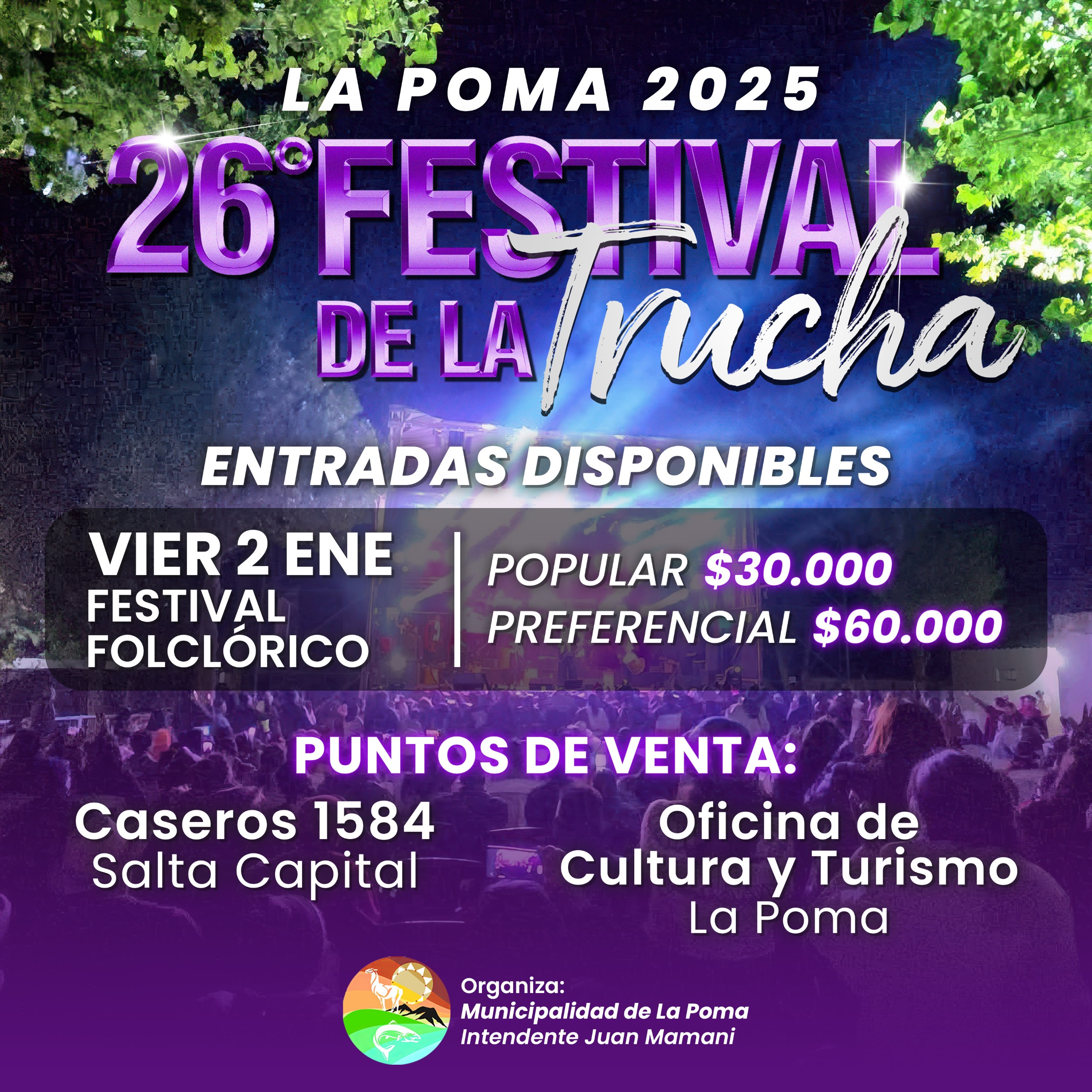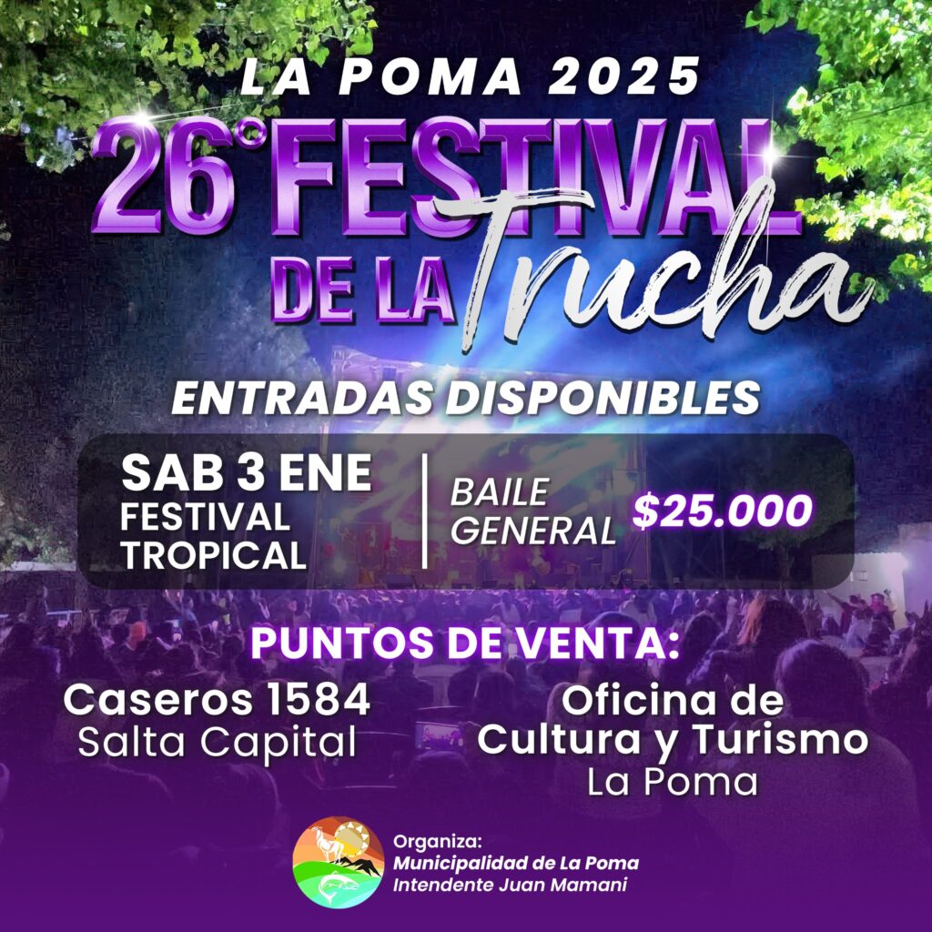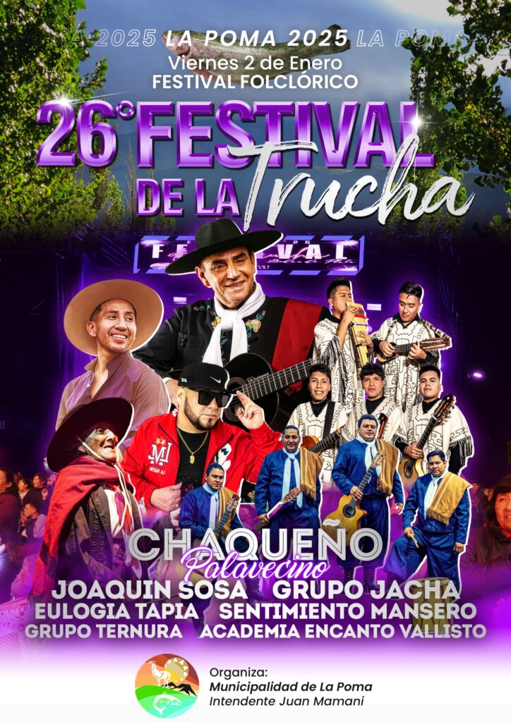 La localidad de La Poma será escenario de la 26° edición del Festival de la Trucha, que se llevará a cabo los días 2 y 3 de enero, de 23 a 1:30, en el Escenario Eulogia Tapia, ubicado sobre calle Madelmo Días, junto al Complejo Municipal. El festival es organizado por la Municipalidad de La Poma y cuenta con el acompañamiento del Ministerio de Turismo y Deportes y la Secretaría de Cultura a través del Programa Provincial de Difusión y Promoción de Fiestas Populares