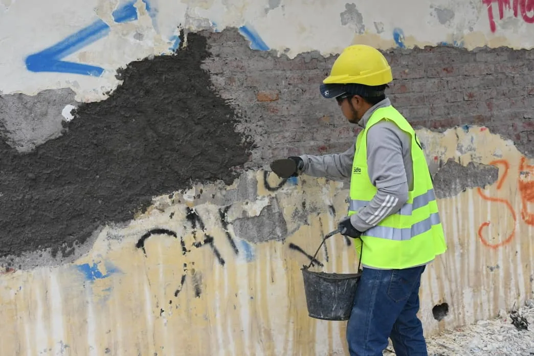 Los trabajos se realizan de manera conjunta entre la Municipalidad y la administración del templo religioso. Los trabajos iniciaron con la remoción del revoque dañado y la limpieza de los grafitis. Se solicita a los peatones circular con precaución y respetar las indicaciones.