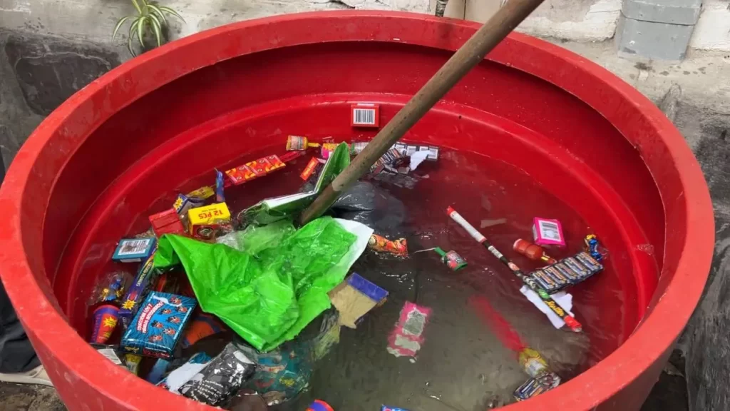 Para destruirla se moja la pirotecnia, debe estar dos horas por lo menos sumergida, luego policía y bomberos continúan con el procedimiento.