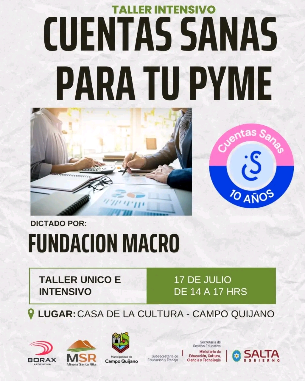 Este miércoles 17 de julio se desarrollará en Campo Quijano el taller intensivo “Cuentas Sanas para tu PyME”, una propuesta gratuita destinada a emprendedores y pequeños empresarios que buscan mejorar la salud financiera de sus negocios.
