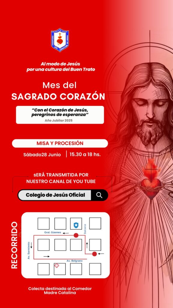 El Colegio de Jesús, en conjunto con el Instituto de Manualidades “Manuela Martínez de Cangas y Tineo”, invita a toda la comunidad a participar de la tradicional procesión del Sagrado Corazón de Jesús, que se realizará este sábado 28 de junio a partir de las 15:30, bajo el lema: “Con el Corazón de Jesús, peregrinos de esperanza”
