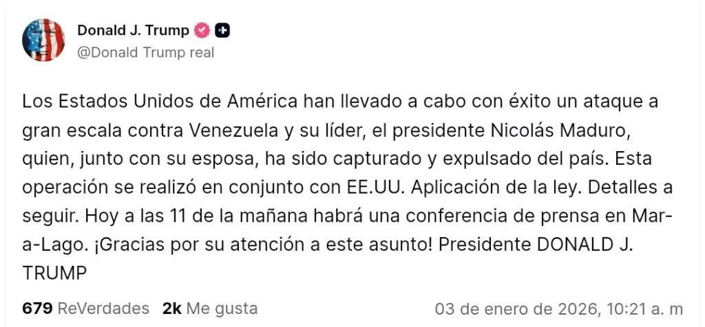 «Los Estados Unidos de América llevaron a cabo con éxito un ataque a gran escala contra Venezuela y su líder, el presidente Nicolás Maduro, quien fue capturado junto con su esposa y trasladado fuera del país», afirmó Trump en su red social, Truth Social